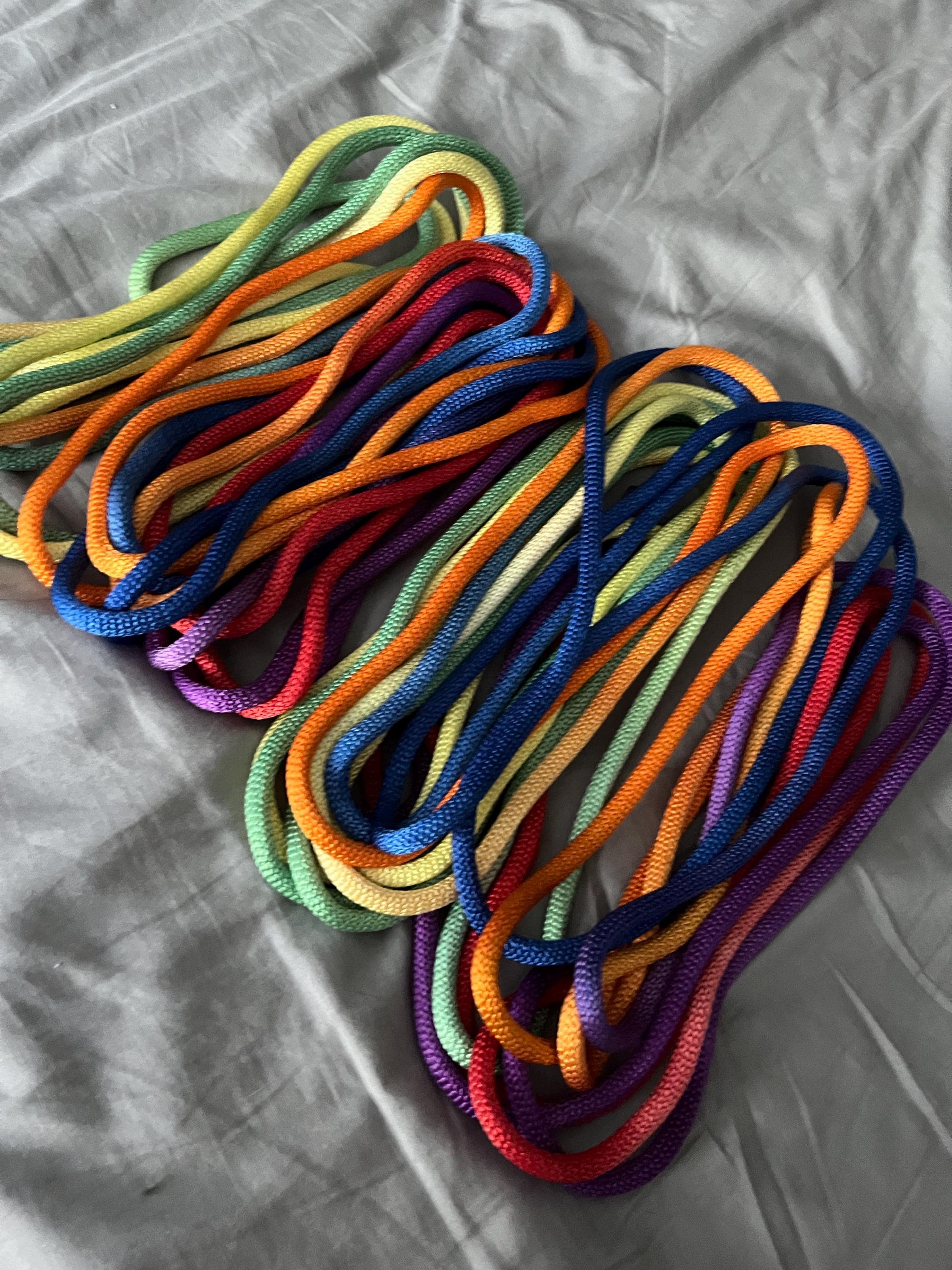Rope had several damaged parts, with pulls and loops in it, making for a rough surface and uncomfortable against the skin. The company has offered me a regular non-rainbow rope to replace it, at a lower value. I've ordered from them before. I like their colors but the quality seems inconsistent. Likely won't order again.
